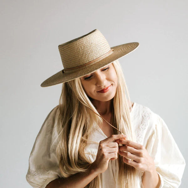 Aiden is a lightweight boater-style straw hat. With a UPF rating of 50+ (excellent) the tightly woven paper straw allows the right amount of sun in while a flat brim provides plenty of shade. Featuring a tonal wooden bead that adjusts the genuine leather chinstrap for the best fit no matter the weather.