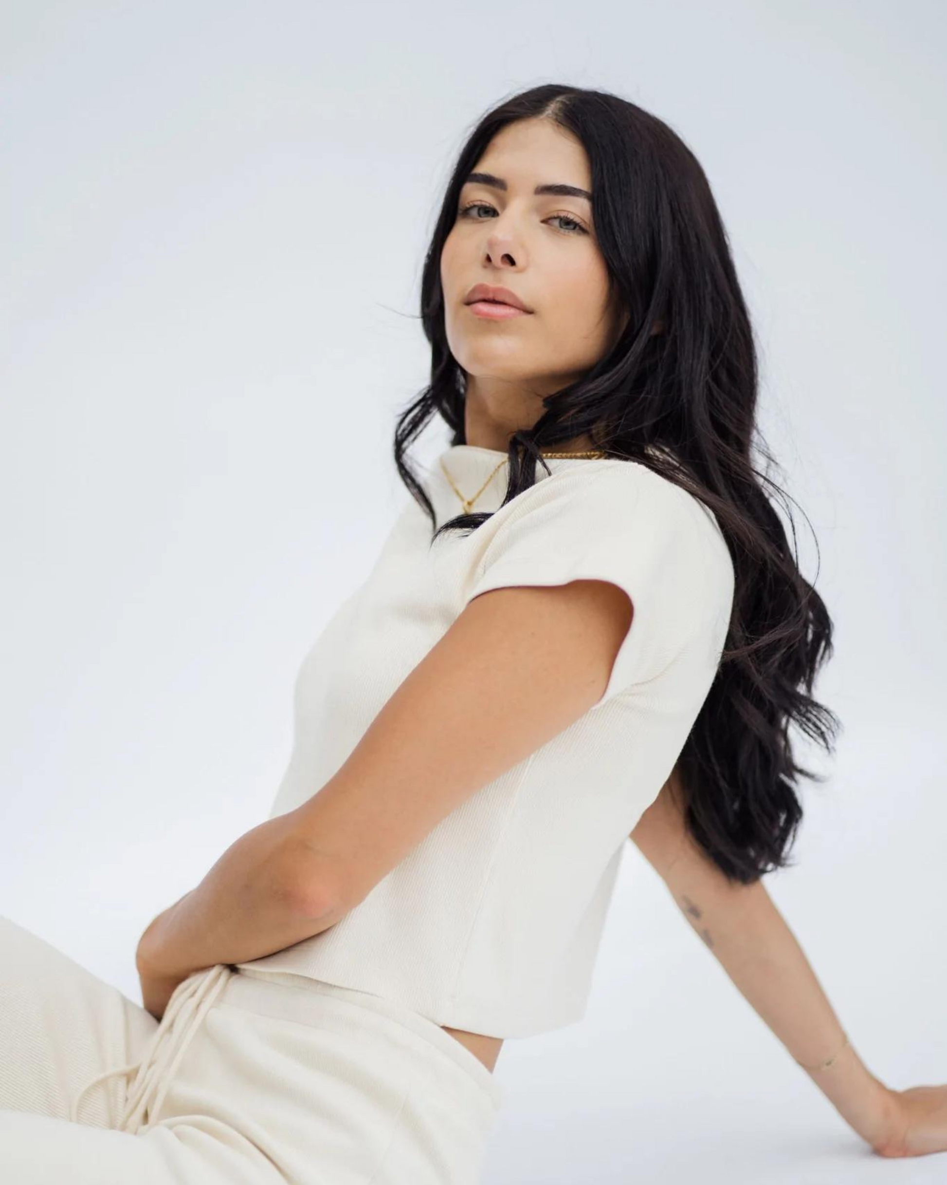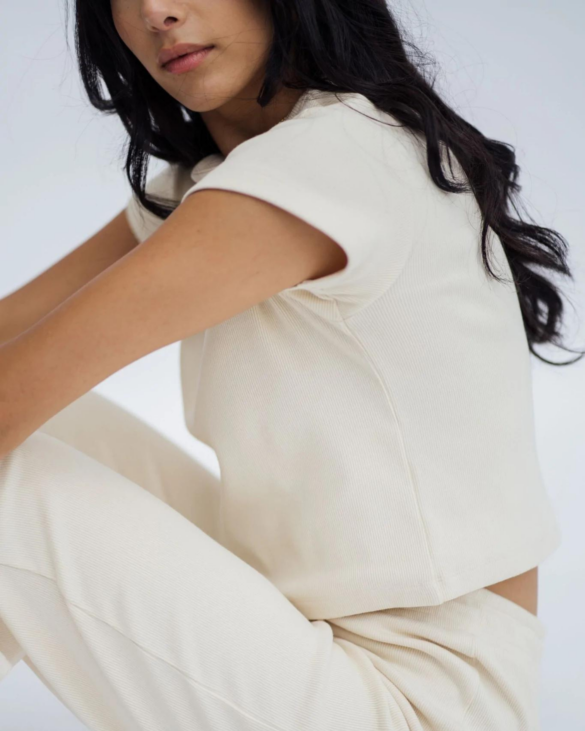 The ribbed baby tee in cream hits right at the waist and features a high scoop neckline and relaxed fit. Made with heavyweight thick stretchy ribbed organic cotton. Pairs well with the wide-leg ribbed pants for a seamless look