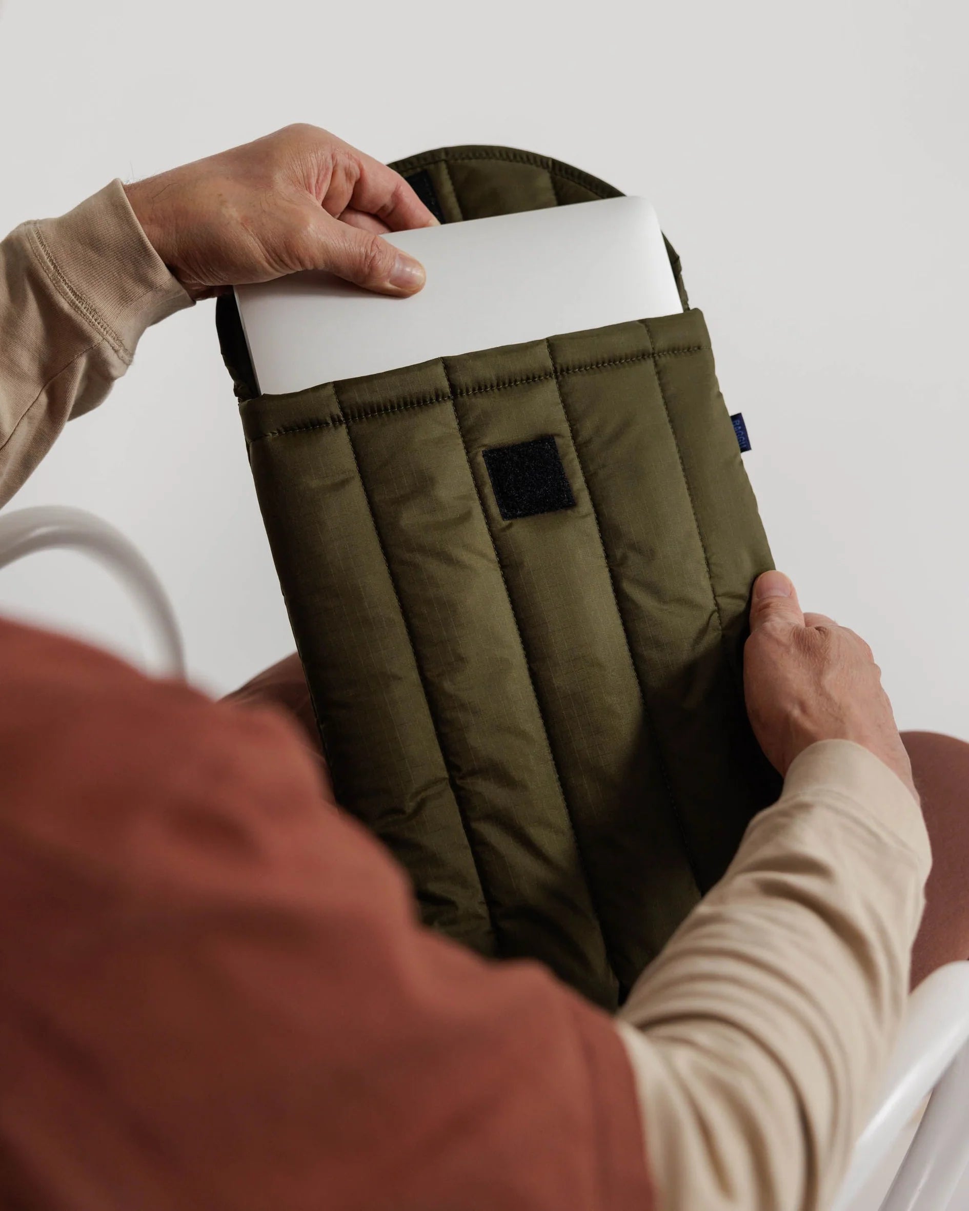 Your laptop does so much for you. Doesn’t it deserve a cozy place to live? Our puffy laptop sleeve is quilted and stuffed to provide your 13"/14" laptop or tablet with just enough padding for comfortable rides. Recycled ripstop nylon, recycled PET polyfill. Machine Washable