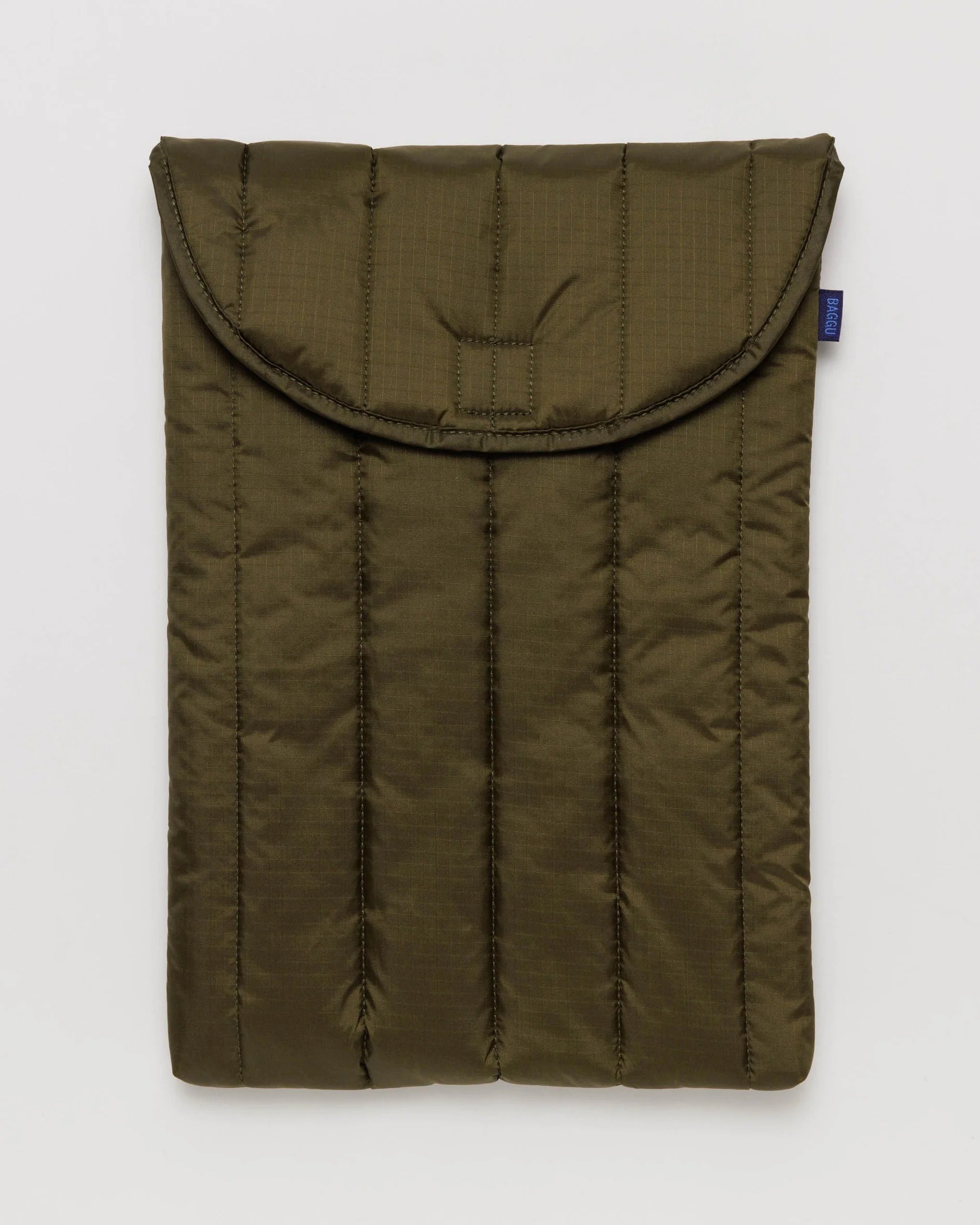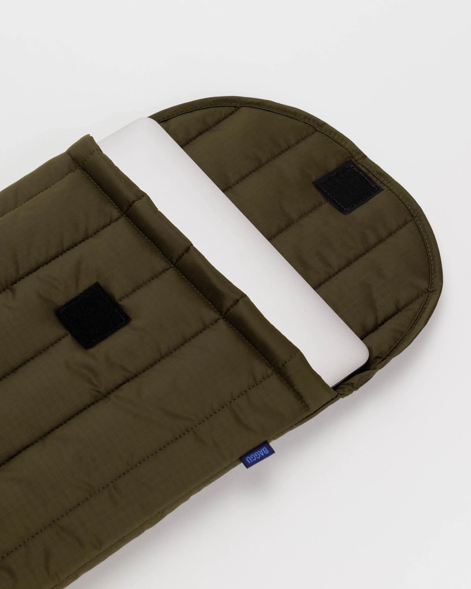 Your laptop does so much for you. Doesn’t it deserve a comfy cozy place to live? Our puffy laptop sleeve is quilted and stuffed to provide your 16" laptop or tablet with just enough padding for comfortable rides. Recycled ripstop nylon, recycled PET polyfill. Machine Washable.
