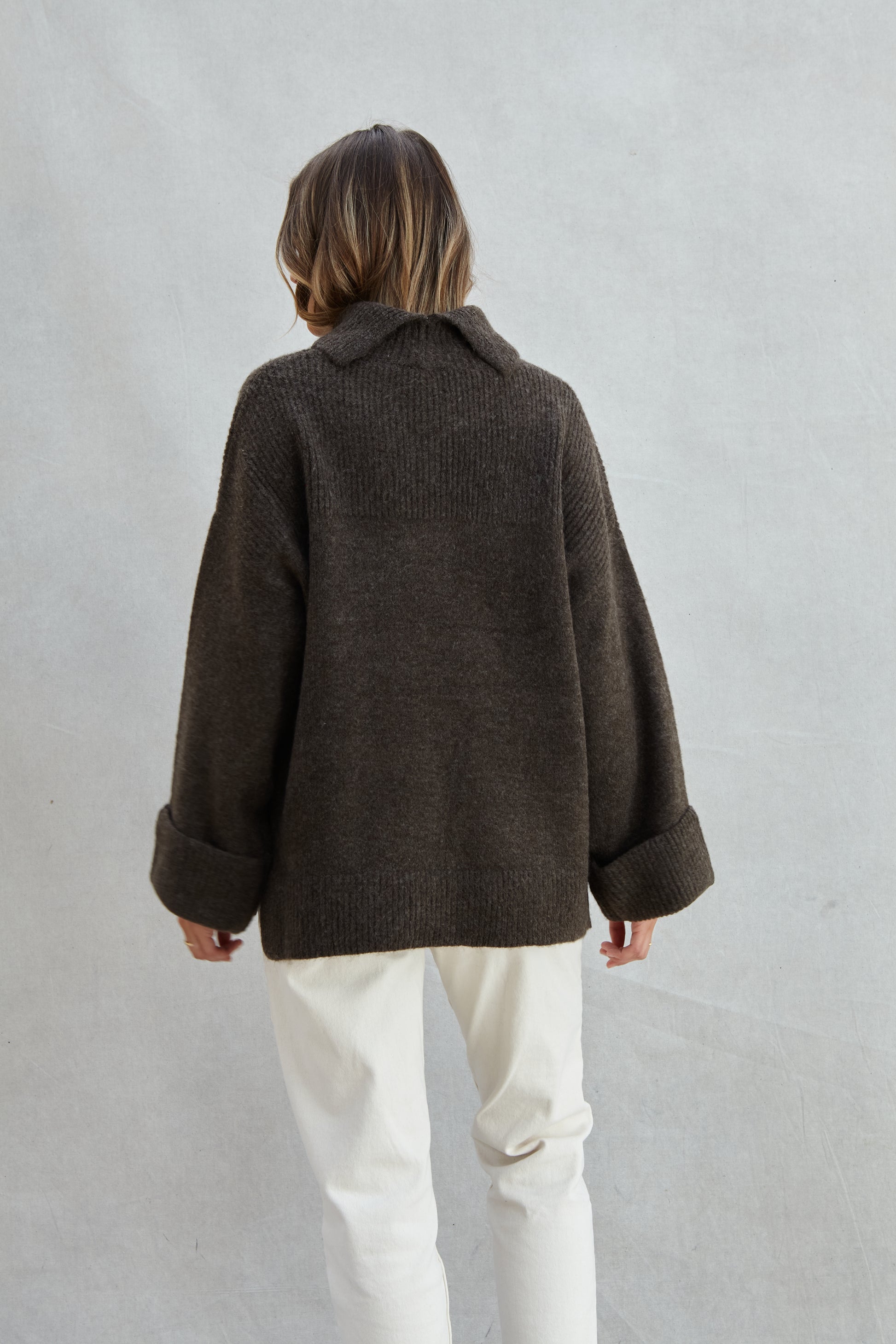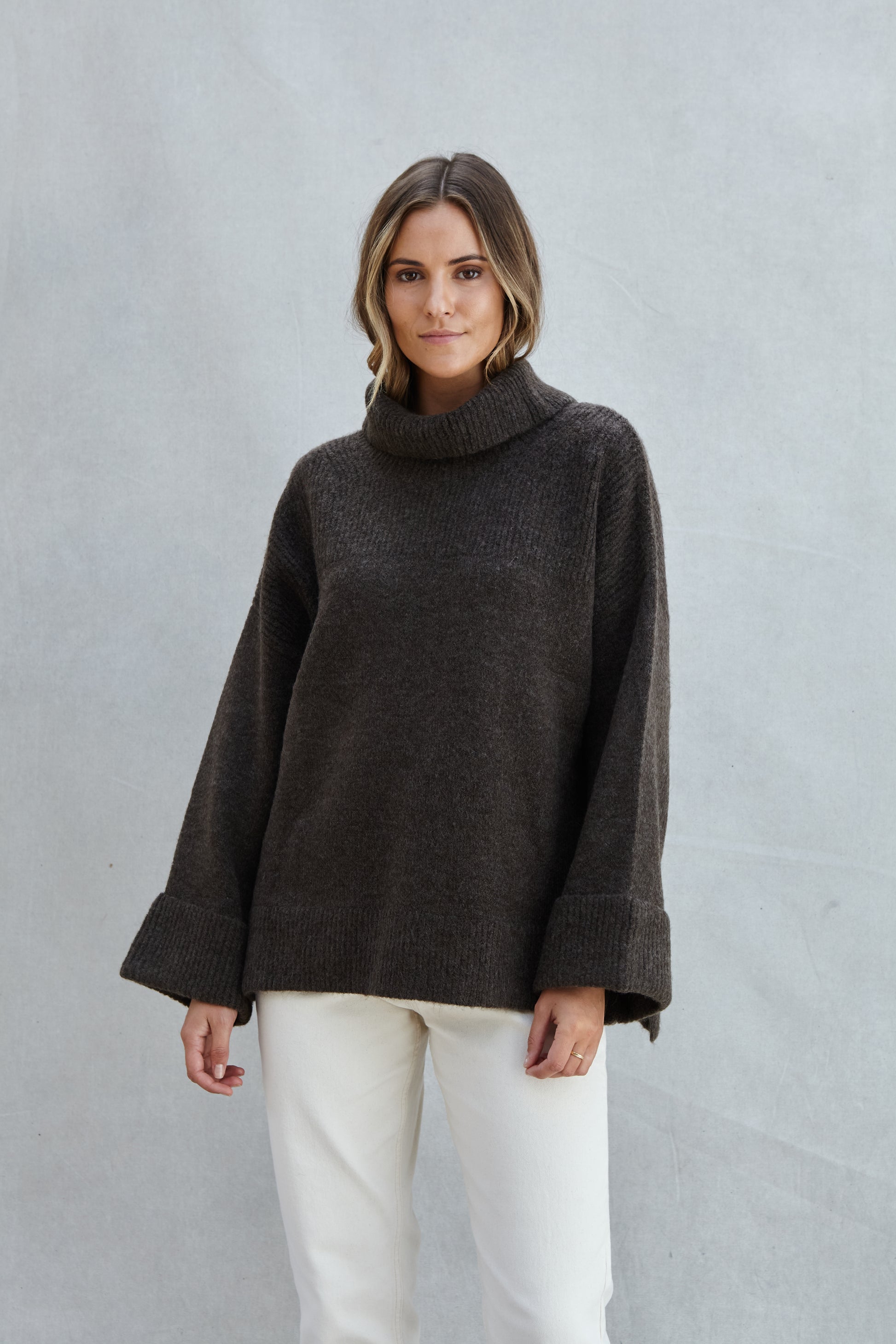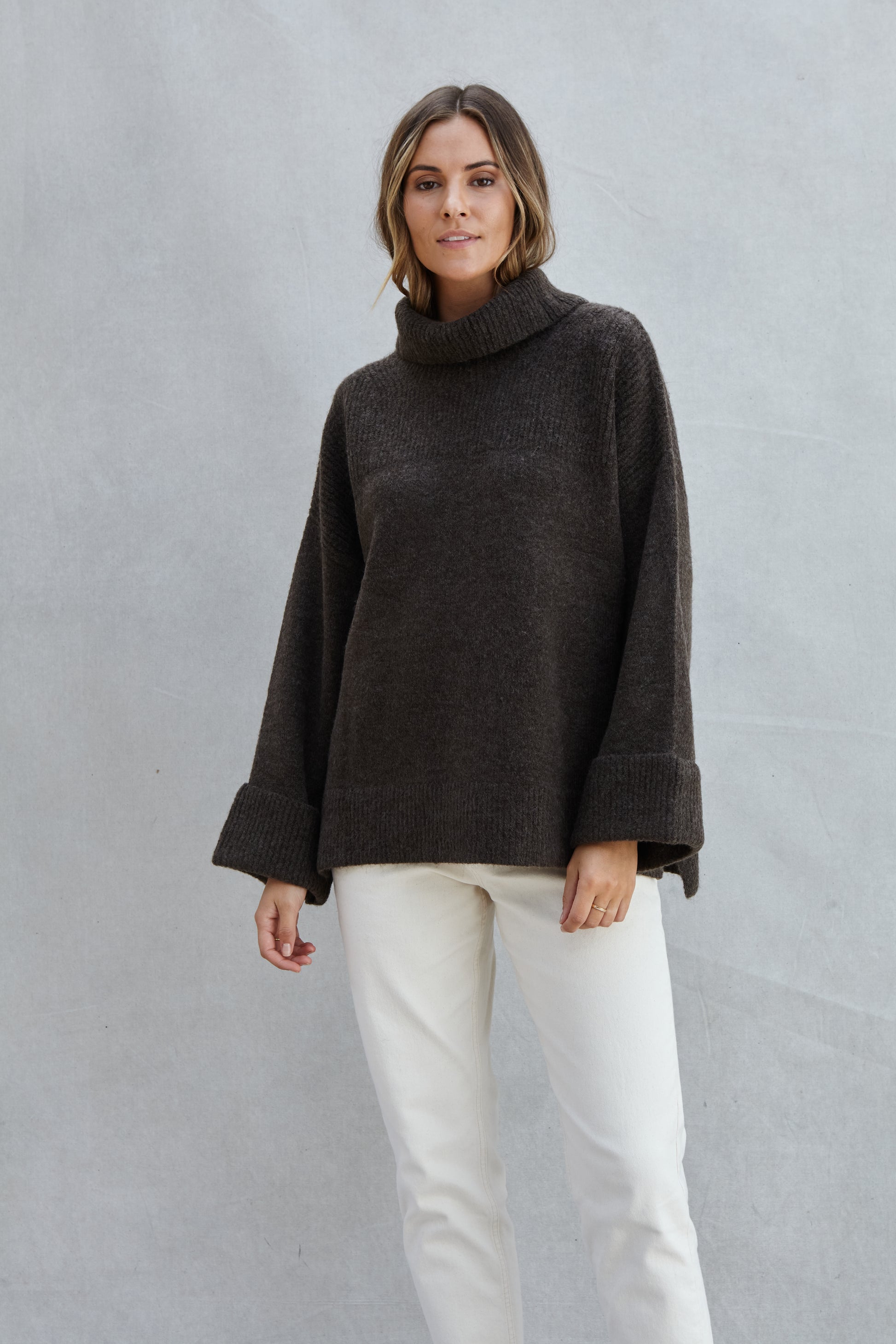 Relaxed fit cosy roll-neck knitted with a turn up cuff - Vanessa is a modern wardrobe essential in a cosy yarn. Beautiful textured stitch detailing with easy side splits for an elevated casual look